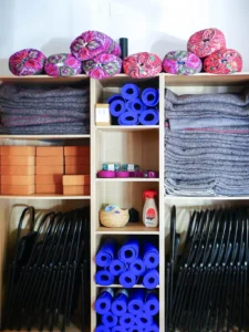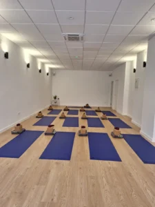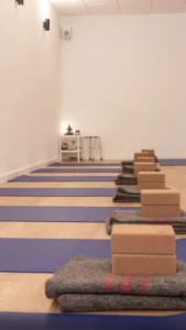 Estudio de Yoga equipado con todo el material necesario para la práctica, incluido en el precio de las clases.
